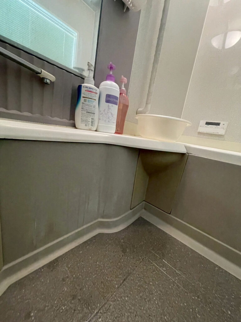 - 浴室:床や壁、蛇口まわりに水垢汚れ(白いウロコ)が目立ち、排水口まわりにはぬめり。パッキンや目地には点在するカビも。